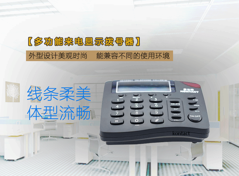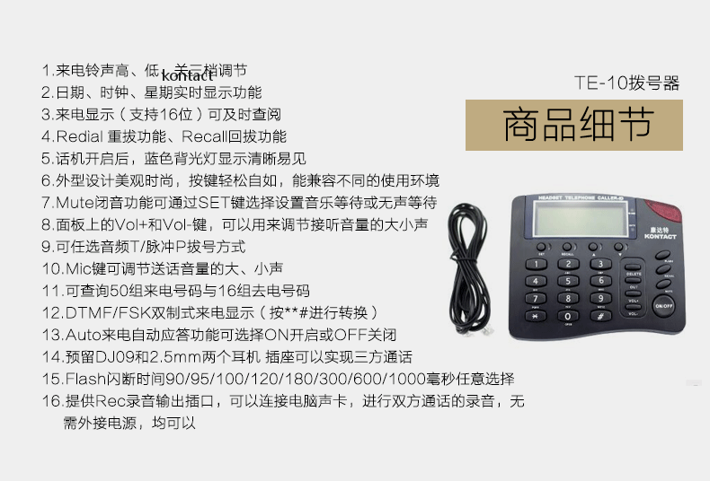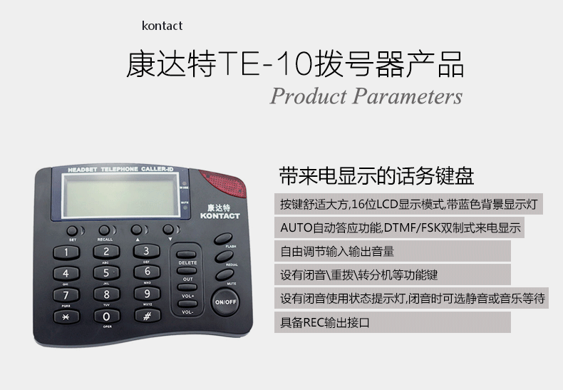带来电显示的话务键盘*按键舒适大方,16位LCD显示模式,带蓝色背景显示灯* AUTO自动答应功能,DTMF/FSK双制式来电显示* 自由调节输入输出音量* 设有闭音重拨转分机等功能键* 设有闭音使用状态提示灯,闭音时可选静音或音乐等待* 具备REC输出接口